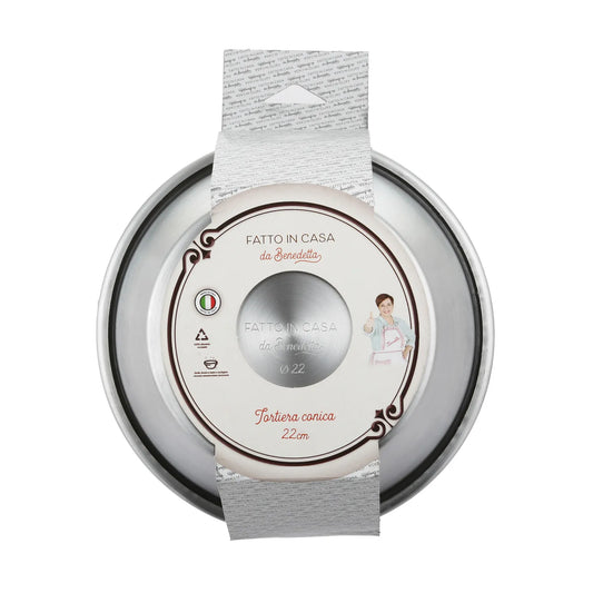 Prezzo scontato €11,90 EURLo stampo da forno con cono e ø 24 cm, prodotto artigianalmente in Italia, è realizzato in alluminio crudo riciclabile e privo di nichel, ideale per ricette dolci e salate. Assicura una cottura uniforme anche ad alte temperature.