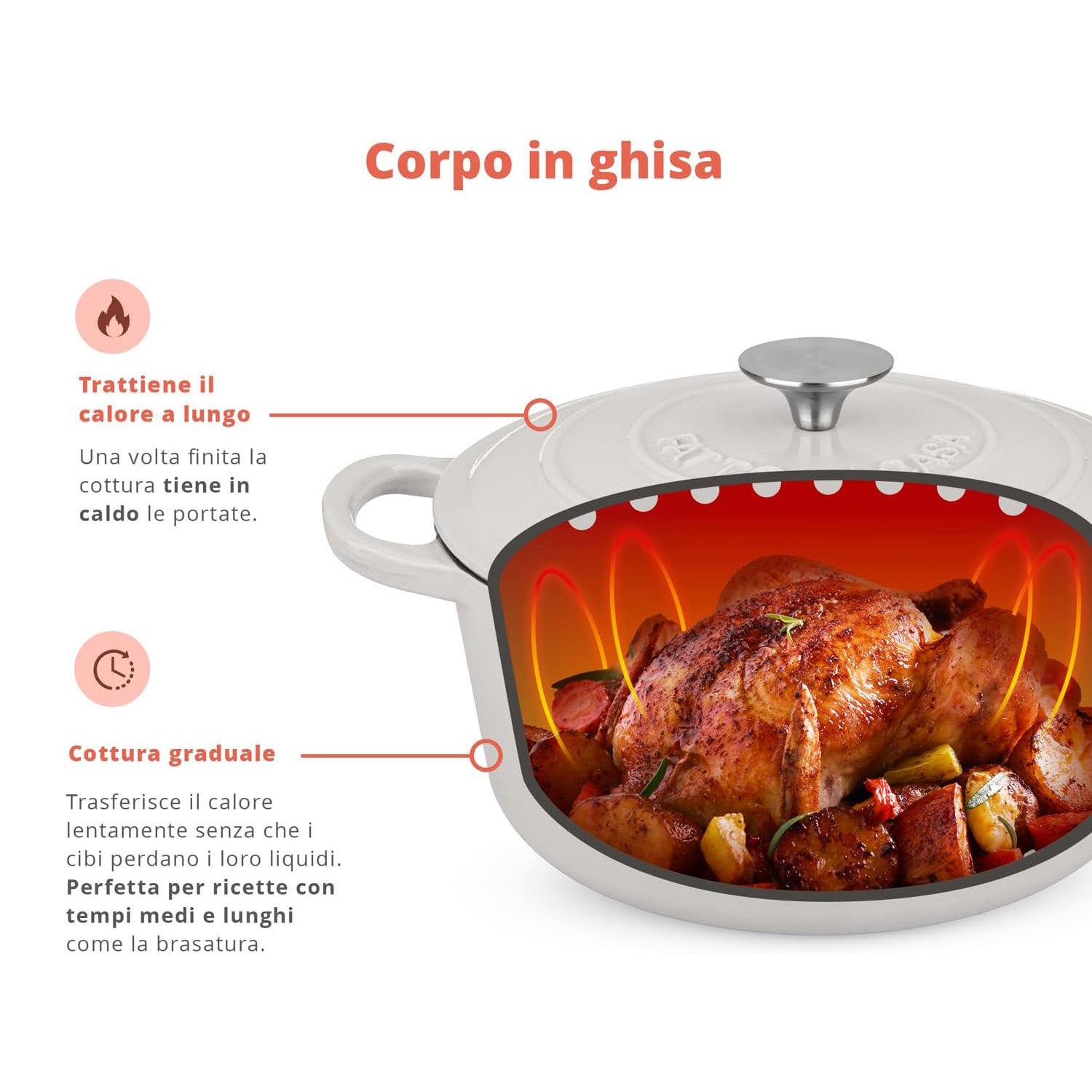 Durante la cottura, la casseruola distribuisce il calore in modo lento e uniforme, preservando la succosità dei cibi, mentre una volta tolta dal fuoco lo trattiene a lungo, mantenendo le pietanze calde più a lungo. Il coperchio convoglia vapore contribuisce ulteriormente a non disperdere il calore e a rendere le preparazioni morbide e saporite.