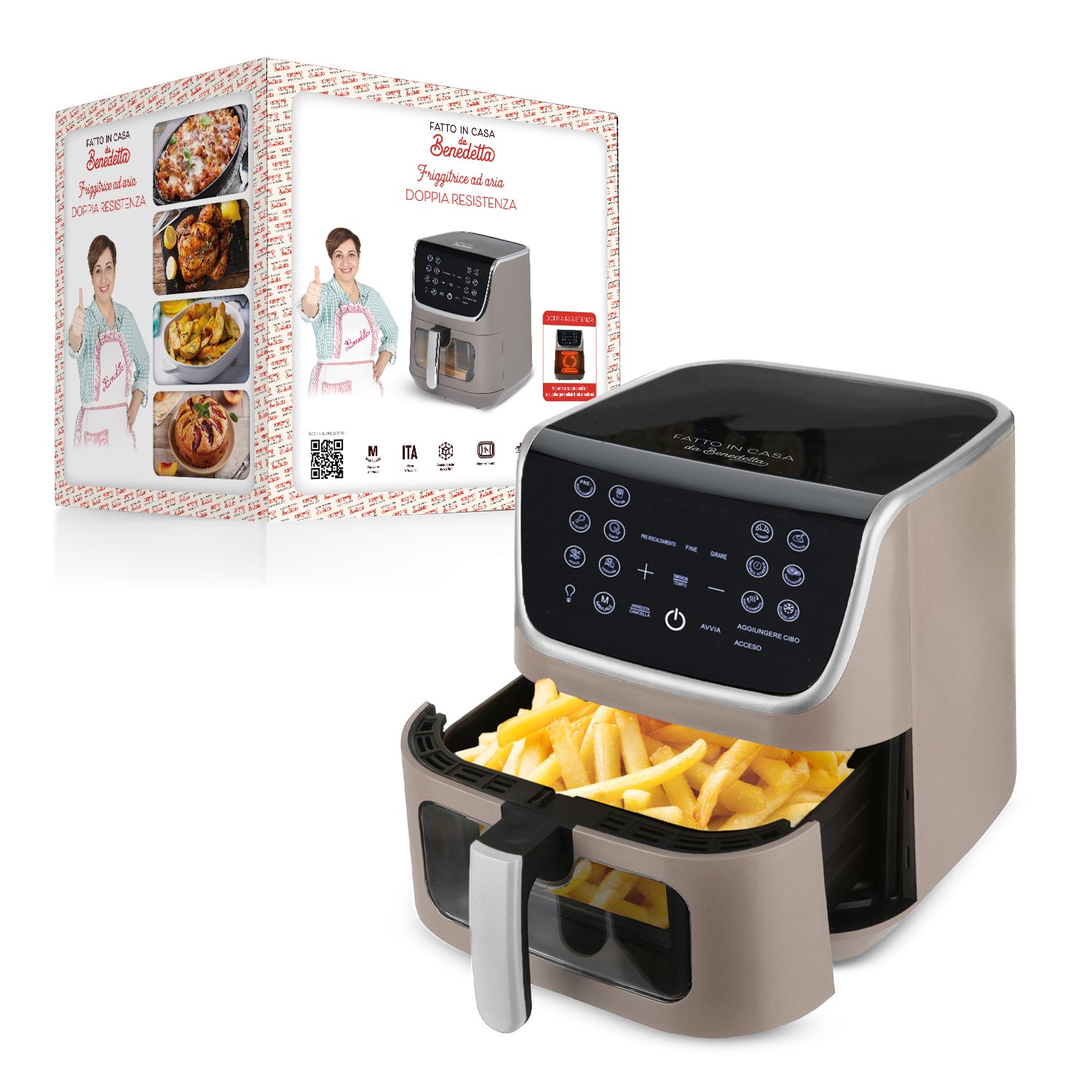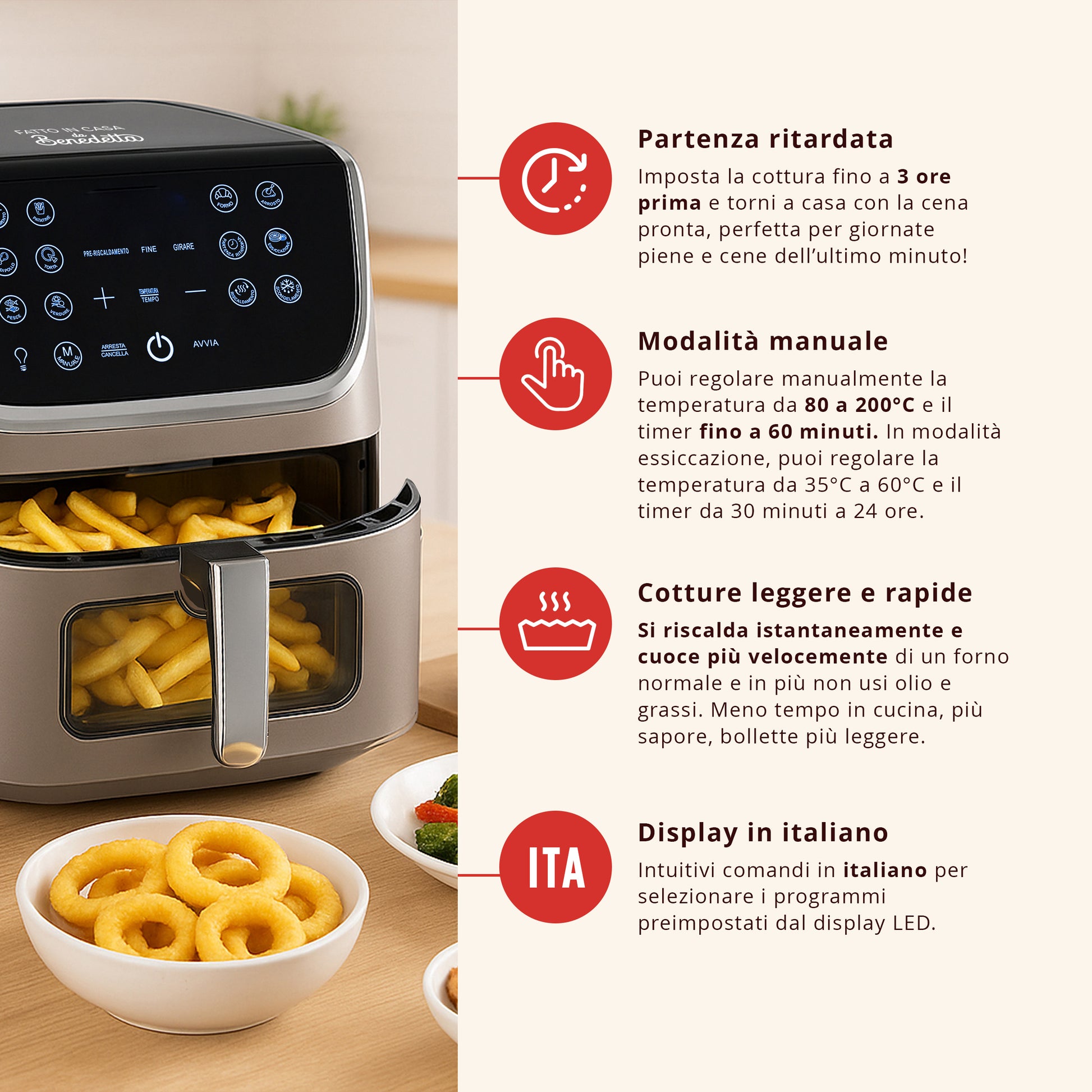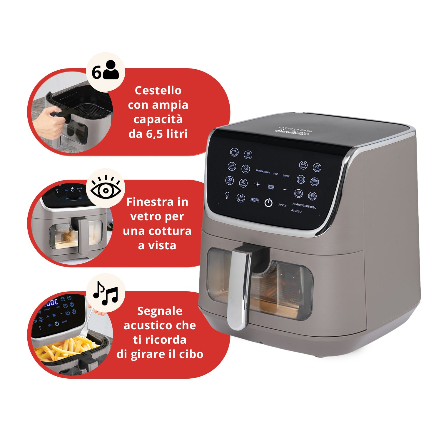 Dotata di luce interna e finestra in vetro, puoi controllare le pietanze a vista in qualsiasi momento. Per ottenere un risultato ottimale, la friggitrice ad aria di Benedetta Rossi, è dotata anche di un avviso acustico che ti ricorderà di girare le tue pietanze a metà cottura!
