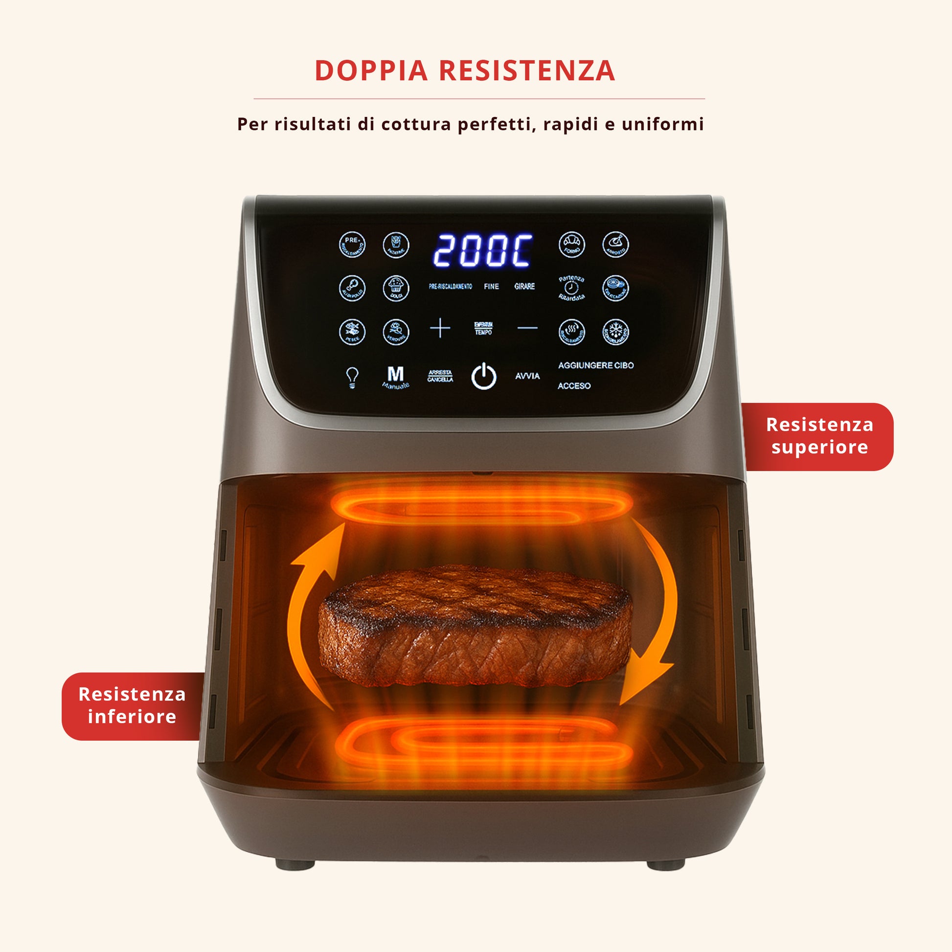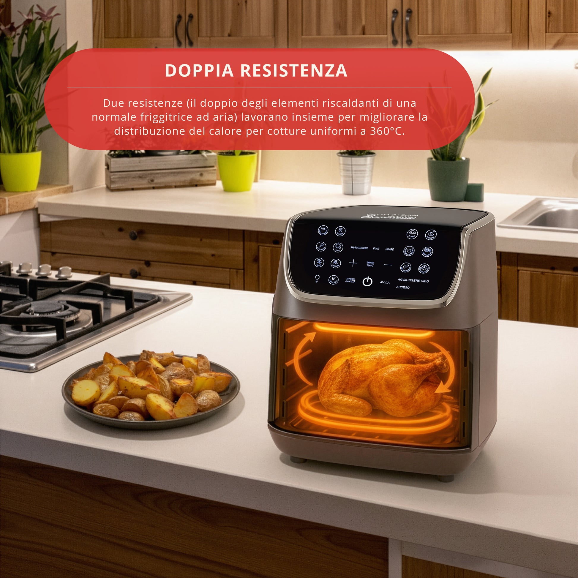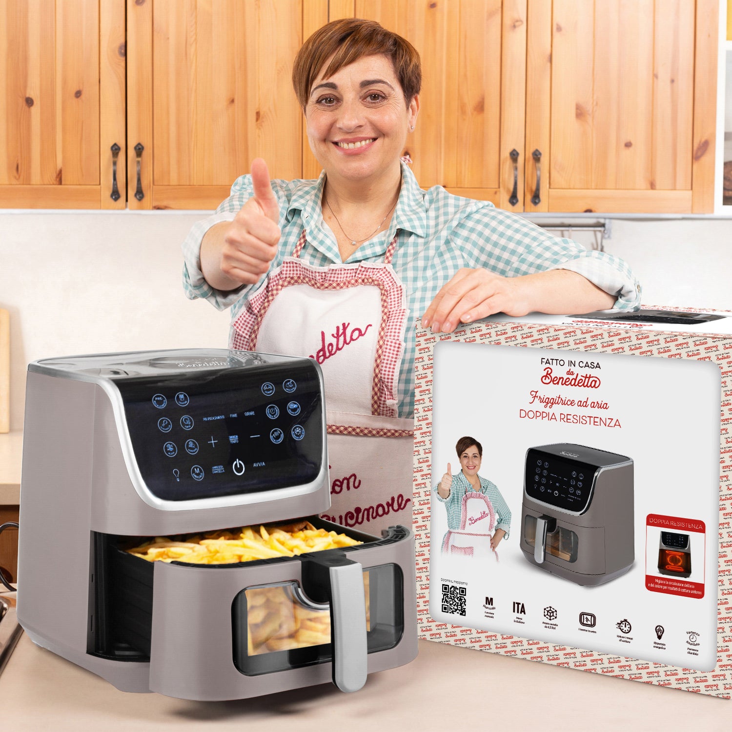 Dotata di luce interna e finestra in vetro, puoi controllare le pietanze a vista in qualsiasi momento. Per ottenere un risultato ottimale, la friggitrice ad aria di Benedetta Rossi, è dotata anche di un avviso acustico che ti ricorderà di girare le tue pietanze a metà cottura!