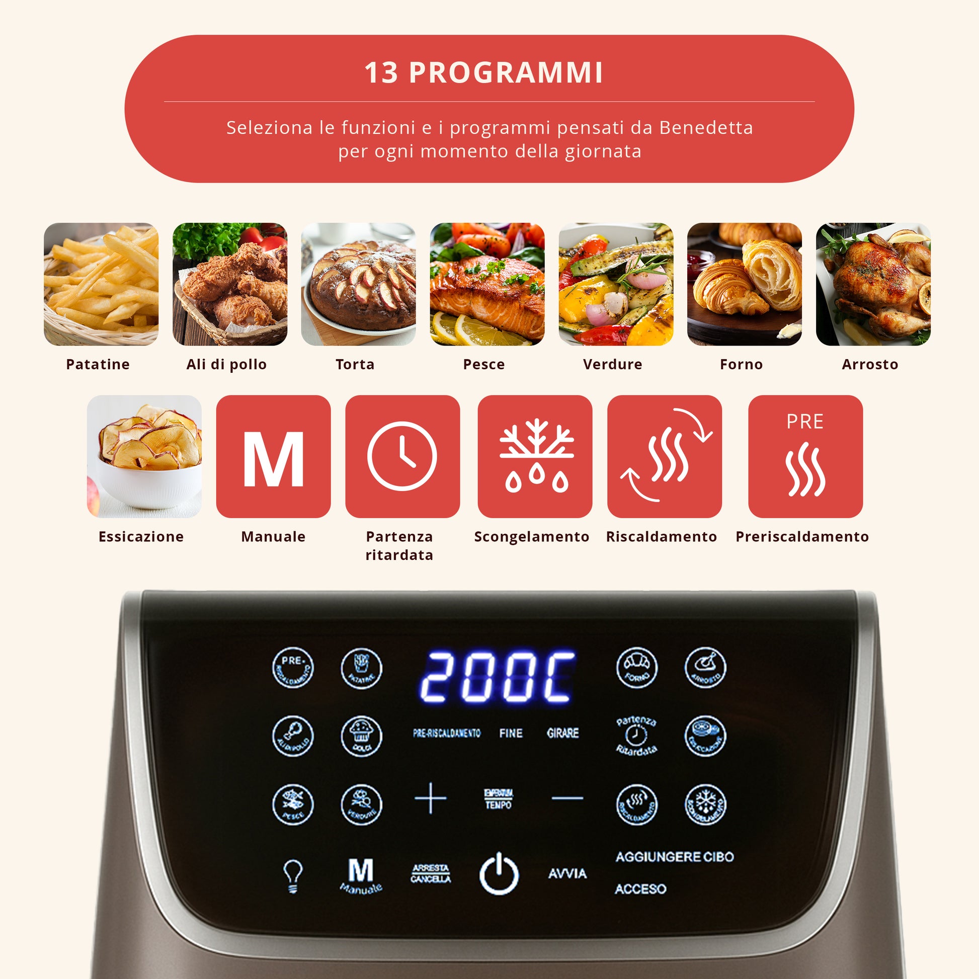 Grazie all'intuitivo display touch, potrai impostare uno dei 12 programmi disponibili per sbizzarirti con ogni tipo di ricetta: fritti croccanti e non oliosi, ali di pollo e bacon, pesce, verdure, ricette al forno, cottura grill e anche essiccazione.